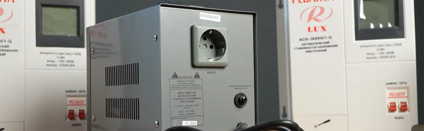 Самый компактный тип стабилизаторов для бытового использования. Пример: стабилизатор РЕСАНТА АСН-12000/1-Ц . Габариты таких приборов обычно не превышают размера микроволновой печи, а мощность составляет 500-2000 ВА. Это бюджетное решение для защиты домашней электротехники от резких колебаний, пониженного и повышенного уровня напряжения сети. Такие устройства не требуют много места, их удобно переносить и устанавливать. Их часто используют для единственного потребителя, например, насоса, котла, холодильника и т.п.