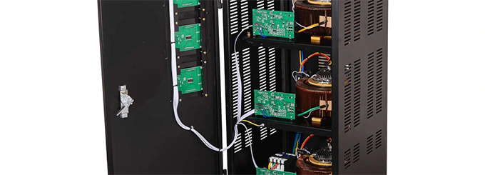 Подключение стабилизатора к сети и нагрузке выполняется с помощью панели с винтовыми зажимами. Устройство состоит из трех электромеханических модулей, каждый из которых регулирует свою фазу. Электронный блок определяет отклонение входного напряжения от нормы. Серводвигатель перемещает скользящий контакт по обмотке автотрансформатора, подстраивая коэффициент трансформации так, чтобы на выходе всегда было стабильное линейное напряжение 380 В ±2%. Регулировка происходит плавно и бесступенчато. Время реакции при отклонении входного напряжения на 10% составляет 0,5 секунды.