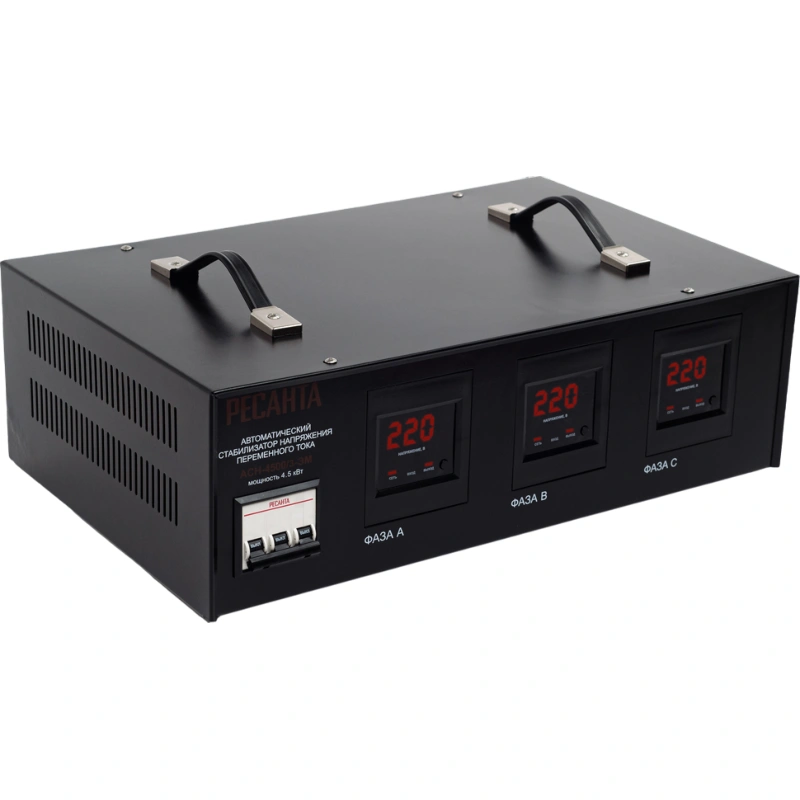 Трехфазный стабилизатор РЕСАНТА АСН-4500/3-ЭМ предназначен для защиты электрооборудования от колебаний напряжения в сетях 380 В. Устройство отличается низким энергопотреблением — 6,6 А на каждую фазу, высокой скоростью и точностью стабилизации, которые составляют 30 В/с и 2%, соответственно. Небольшой прибор с двумя ручками для переноски компактно размещается на столе или стеллаже.