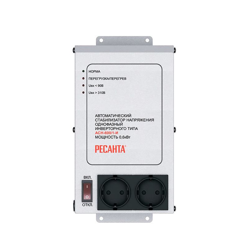 На лицевой панели РЕСАНТА АСН-600/1-И находятся 4 светодиода, которые сообщают о состоянии стабилизатора. 1 из них горит постоянно, если никаких неисправностей нет. 3 других загораются, если случается перегрузка или перегрев, либо напряжение падает ниже 90 В или превышает 310 В.