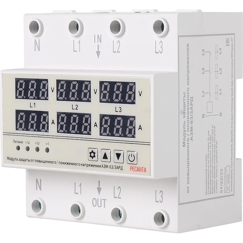 Автоматический защитный модуль АЗМ-63/3АРД регулируемый (с дисплеем) Ресанта - автоматическое устройство защиты от повышенного/пониженного напряжения, в основном используемое для низковольтных распределительных линий для бытовых и аналогичных целей, автоматически обнаруживает сбой, связанный с повышением или понижением напряжения, и отключает нагрузку. При восстановлении нормальных условий на линии, автоматически включает нагрузку. Включение и выключение происходит за счет трех электромагнитных реле.