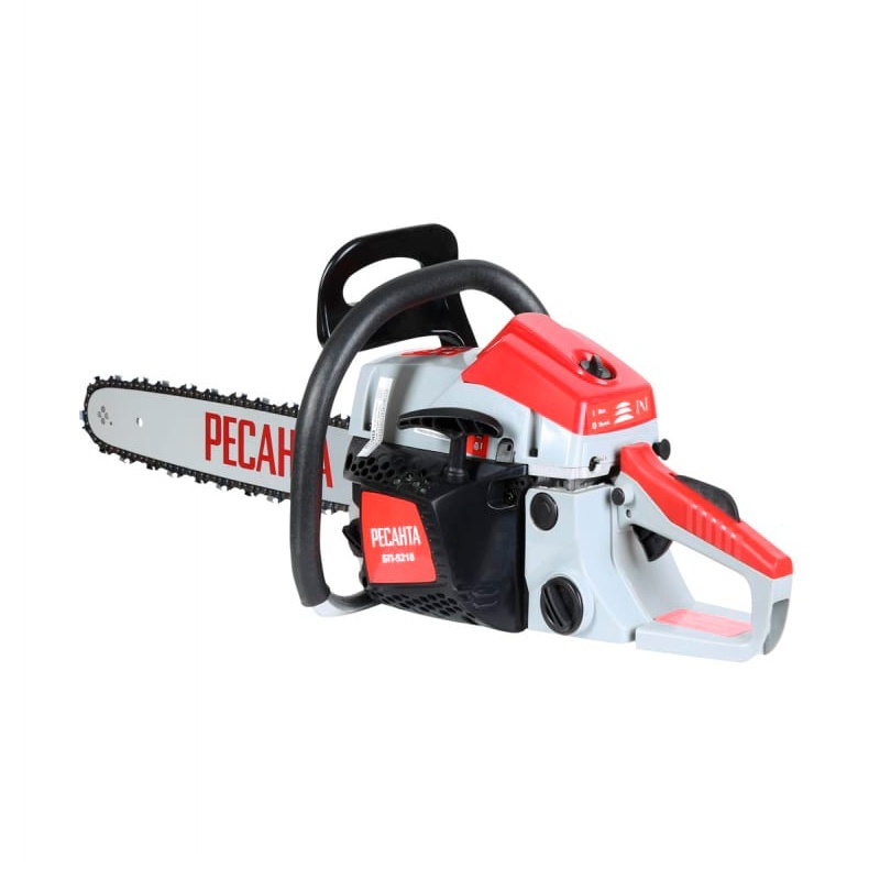 Механизм тормоза цепи легко снимается через переключение специальной ручки. Это упрощает очистку мотопилы Ресанта БП-5218 от опилок. Быстросъемный воздушный фильтр обслуживается без дополнительных инструментов.