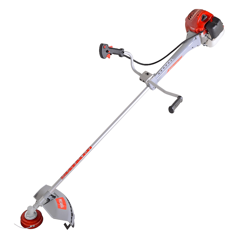 В комплект поставки бензинового триммера входит катушка с леской, которая используется для кошения травы, и диск для срезания высоких сорняков и поросли кустарников. Рукоятка велосипедного типа позволяет надежно удерживать инструмент двумя руками и легко менять направление кошения.