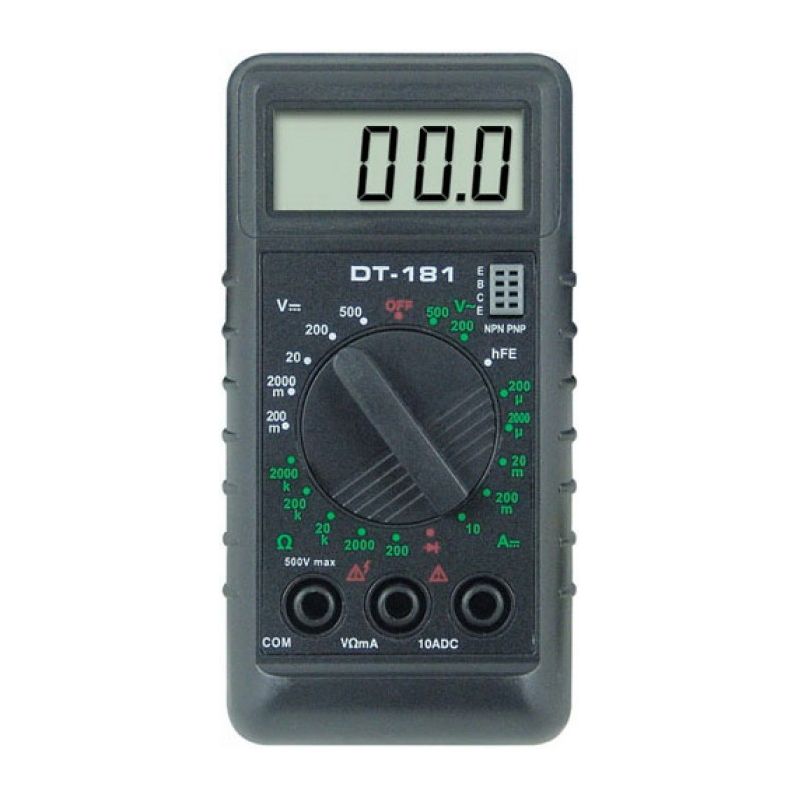 Мультиметр Ресанта DT181 предназначен для измерения напряжения, тока, сопротивления, проверки диодов, транзисторов, звуковой прозвонки.